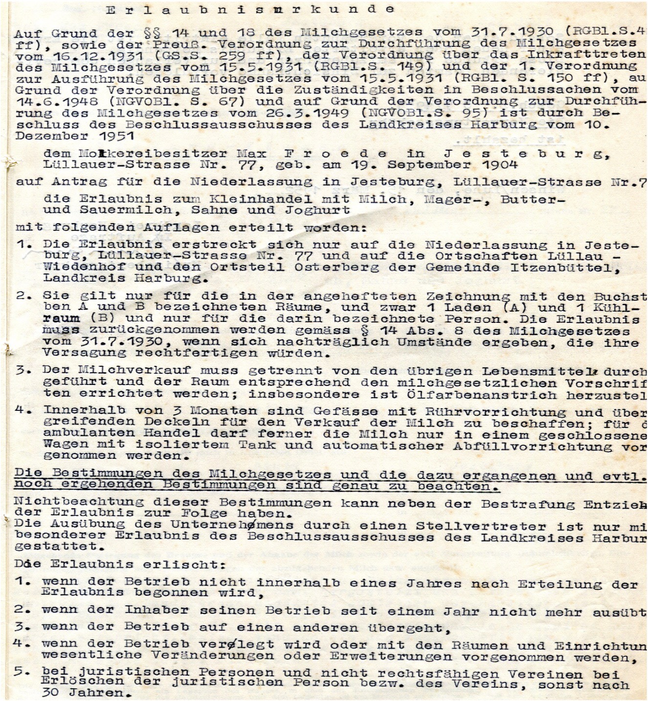 1951_12_10_Molkerei Froede_Erlaubnisurkunde_Verkauf Milcherzeugnisse